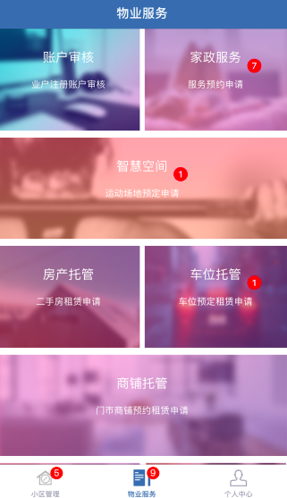 包含账户审核,家政服务,智慧空间,房产托管,车位托管,商铺托管,在线咨询,装修申请,商品订单