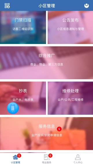 包含门禁扫描,公告发布,综合推广,抄表,维修处理,服务信息,蓝牙开门,访客邀请,设备巡检