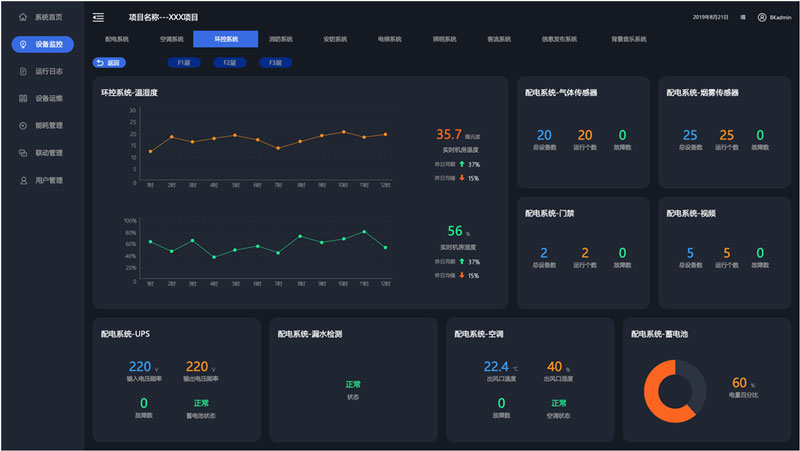瑞铭智慧楼宇解决方案可根据项目需求动态配置环境监测及主要设备运行状态监测可视化界面,室内监测数据实时刷新,用户可直观了解建筑的运行情况。根据项目能耗分配及具体支路划分,可视化、定置化展示能源使用情况,能耗数据实时刷新,用户可直观了解能耗具体用途、用量、用处以及能耗平衡情况。系统将建筑总能耗分解到不同的用户和不同的系统,给出分户、分项能耗,为节能管理提供数据基础。