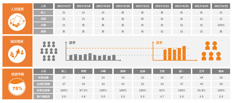 通过对人员、组织的基础信息维护和排班管理,实现人员与每个任务数据关联,支撑基于真实数据的人员或组织绩效管理。